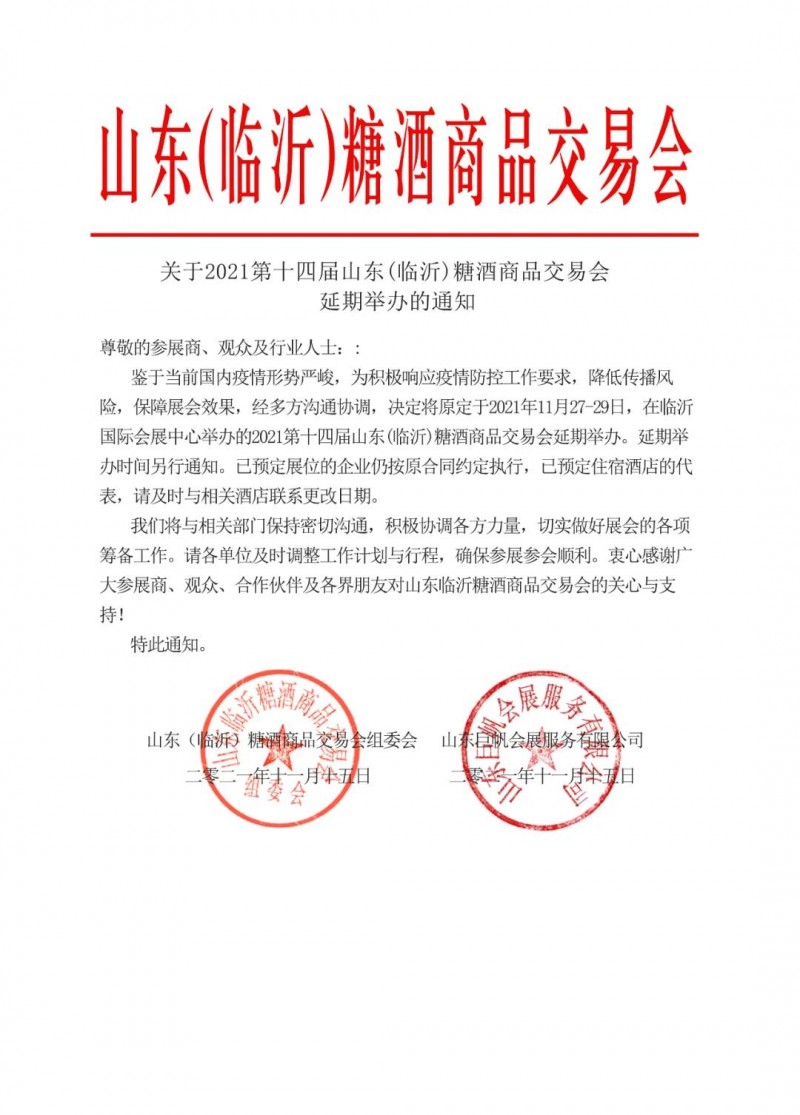 2021第十四屆中國(臨沂)國際糖酒商品交易會(延期舉辦) 狀態(tài)