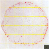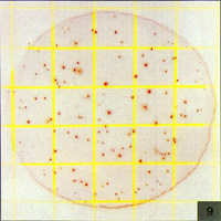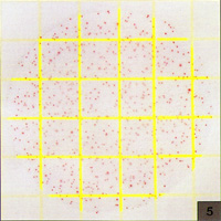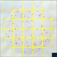 Count=560測試片面積約為20cm2,當(dāng)菌落數(shù)超過250個,如圖5所示,為了估計菌落數(shù),可選擇其中一個或數(shù)個有代表性菌落的小方格(1cm2),計算平均菌落數(shù),再乘以20可得到整個測試片上的菌落數(shù) |