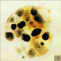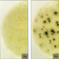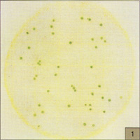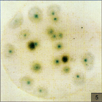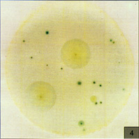 圖6所示在PYM測(cè)試片邊緣框里光亮區(qū)的的小型.蘭色菌落同樣也分布在整個(gè)測(cè)試片中(盡管有較小的可見度),這是膠木菌菌落太多無法計(jì)數(shù)(TNTC)現(xiàn)象.
