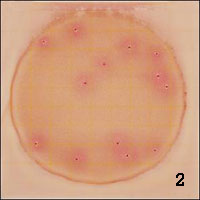 食品顆粒通常呈不規(guī)則形狀,且不帶有氣泡。見圓圈1。在測試片上,人為的氣泡可能由于接種不當(dāng)引起,其形狀不規(guī)則,且不帶有紅色菌落。見圓圈2 。